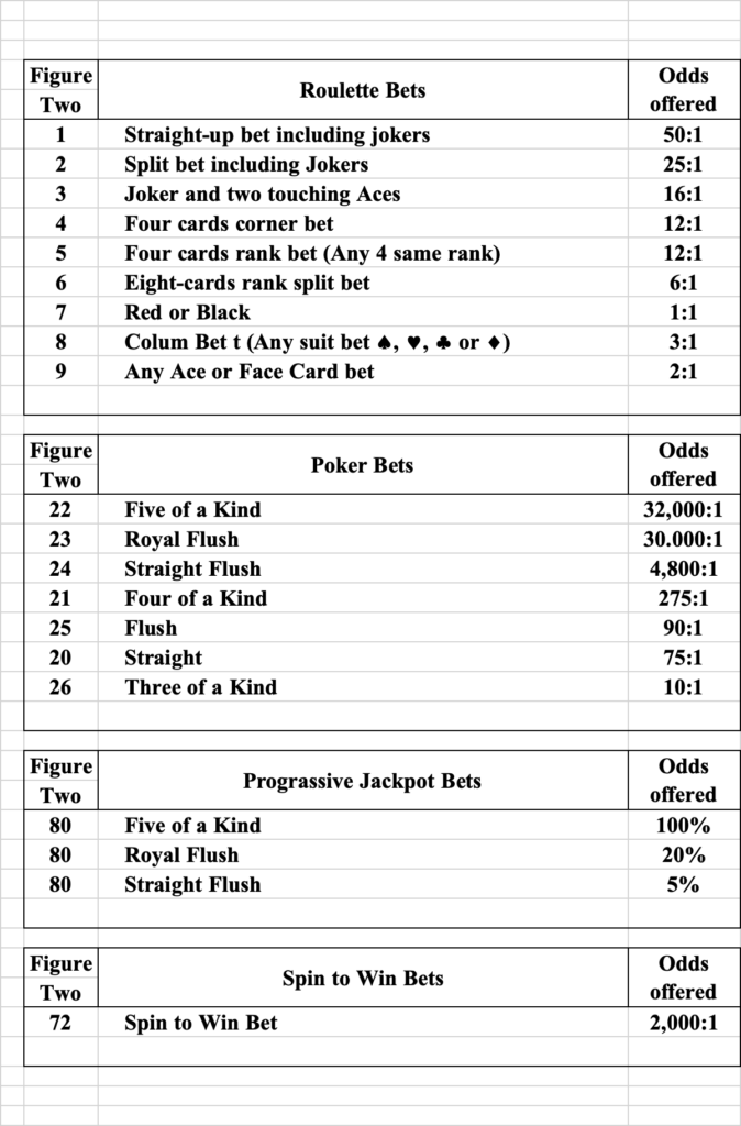 2. During the game, five cards are dealt; one of which is selected as the “Roulette Card” and will be used for the Roulette wagers; together, all five cards will make a five-card poker hand. Jokers in the poker hand are fully wild.