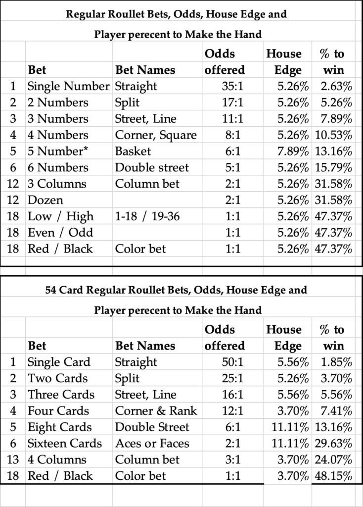 a. Roulette Wagers, which will cover one or more cards and will win if the Roulette Card is one of the cards covered by the player’s wager; the available Roulette Wagers are as follows: